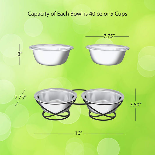 Set of 2 Elevated Dog Bowls - Stainless-Steel 40 OZ Large Food and Water Bowls for Pets with Raised 3.5-Inch-Tall Decorative Stand by ,Silver/Black