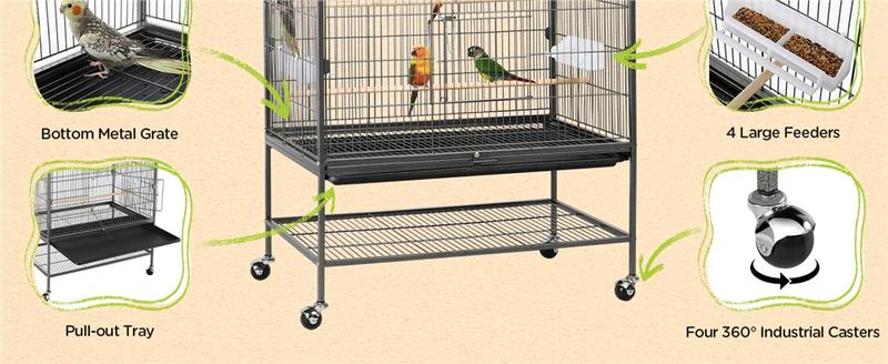 8. 【Smooth & Effortless Rolling】 The four-wheeled stand allows for the convenient maneuverability of this large birdcage. Ball-shaped casters can roll smoothly in all directions